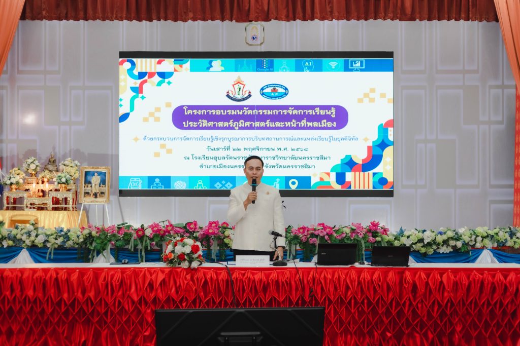 การอบรมครั้งนี้ได้รับเกียรติจาก ว่าที่ร้อยเอก ดร.ทิณกรณ์ ภูโทถ้ำ ผู้อำนวยการสำนักงานเขตพื้นที่การศึกษามัธยมศึกษานครราชสีมา เป็นประธานในพิธีเปิดและบรรยายพิเศษ พร้อมด้วย ดร.วันทิตา ทะลาสี ผู้อำนวยการกลุ่มนิเทศ ติดตามและประเมินผลการจัดการศึกษา สังกัด สพม.นครราชสีมา และ นายปรเมษฐ์ ผลนา พร้อมคณะผู้ช่วยวิทยากรจากโรงเรียนพิมายวิทยา มาร่วมบรรยายและจัดกิจกรรมเชิงปฏิบัติการ เพื่อพัฒนาศักยภาพครูในการบูรณาการรายวิชาประวัติศาสตร์ ภูมิศาสตร์ และหน้าที่พลเมือง เข้ากับบริบทพื้นที่ชุมชนอย่างมีประสิทธิภาพ ผ่านกระบวนการจัดการเรียนรู้เชิงรุกและการใช้แหล่งเรียนรู้ในยุคดิจิทัล